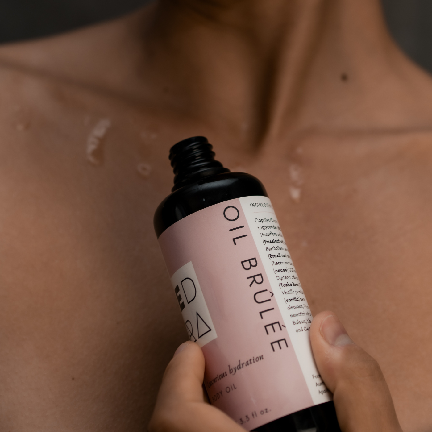 Oil Brûlée body oil is a sensual body oil made exclusively from plants and essential oils. Made with non comedogenic oils such as MCT oil, passionfruit seed oil, and brazil nut oil, Oil Brûlée is light enough to use every day. But what makes Oil Brûlée so special is that it smells deliciously sweet, like a baked crème brulée. Oil Brûlée is perfumed exclusively with essential oils of Tonka bean, cacao CO2 extract, vanilla oleoresin, Peru balsam, ylang ylang, and bergamot.